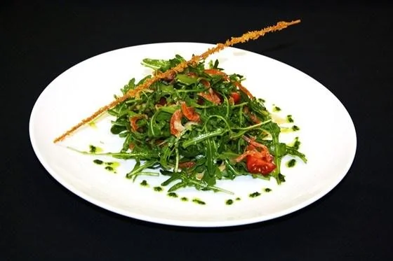 ШАГ 1 Руколу перебираем, отрезаем ножки и моем, лук нарезаем кольцами, черри режем пополам, лосось и блин нарезаем соломкой.