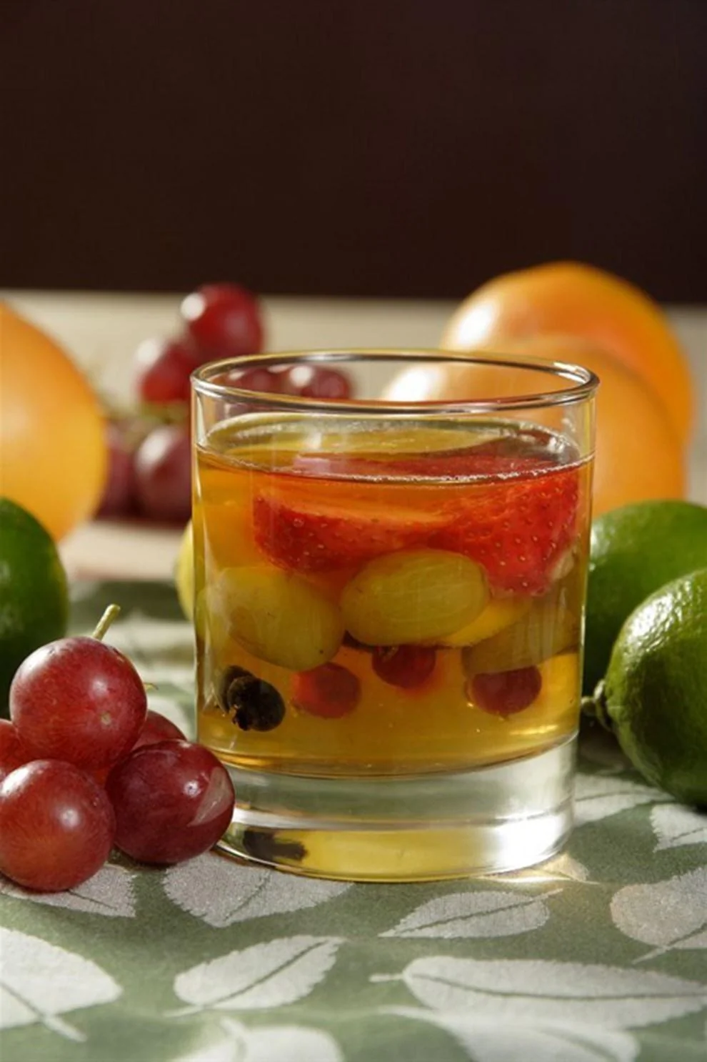 ШАГ 3 Горячий сироп процедить сквозь полотно, слегка охладить его, разлить в вазочки или формы слоем 1–2 см и дать застыть. На застывший слой желе уложить различные фрукты и снова залить их полузастывшим желе так, чтобы оно покрыло поверхность фруктов, и снова охладить.