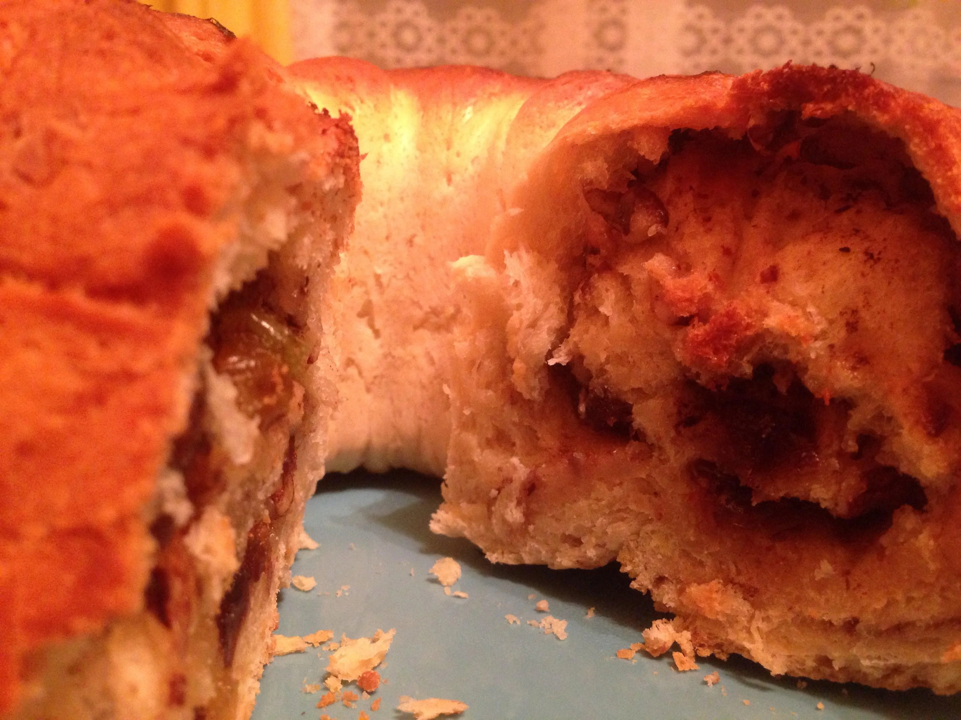 ШАГ 3 На рабочей поверхности раскатать пласт толщиной примерно в 1 см. Смазать его растопленным сливочным маслом, посыпать сахаром, корицей, изюмом и измельченными орехами. Свернуть плотный рулет и уложить по кругу в смазанную сливочным маслом круглую форму с отверстием посередине.