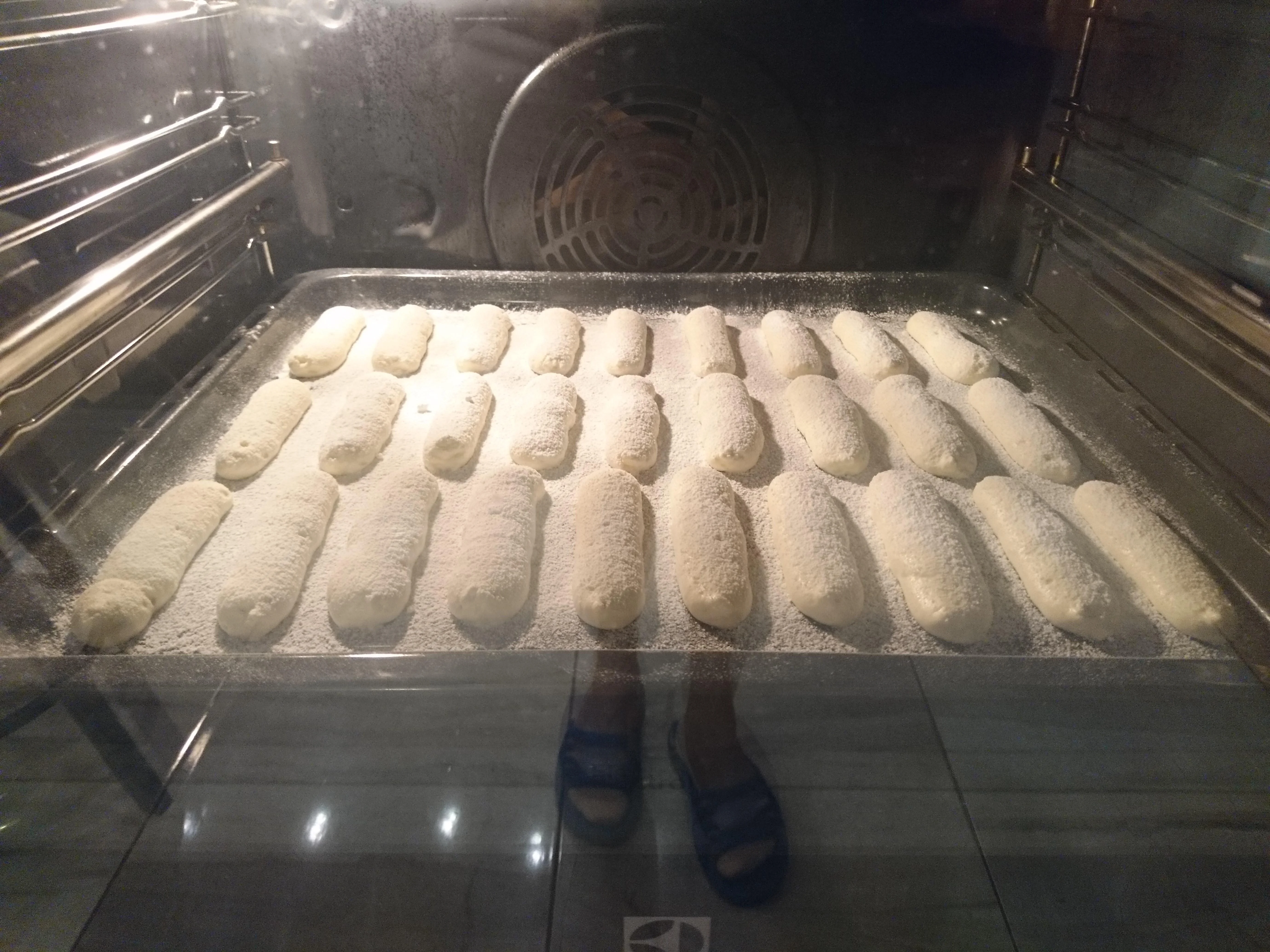 ШАГ 2 Разогрейте духовку до 150 градусов. Смажьте противень сливочным маслом и слегка посыпьте мукой. При помощи кондитерского шприца выдавите палочки савоярди на противень. Каждая палочка должна быть около 10 см. Диаметр шприца должен быть около 1,5 см.