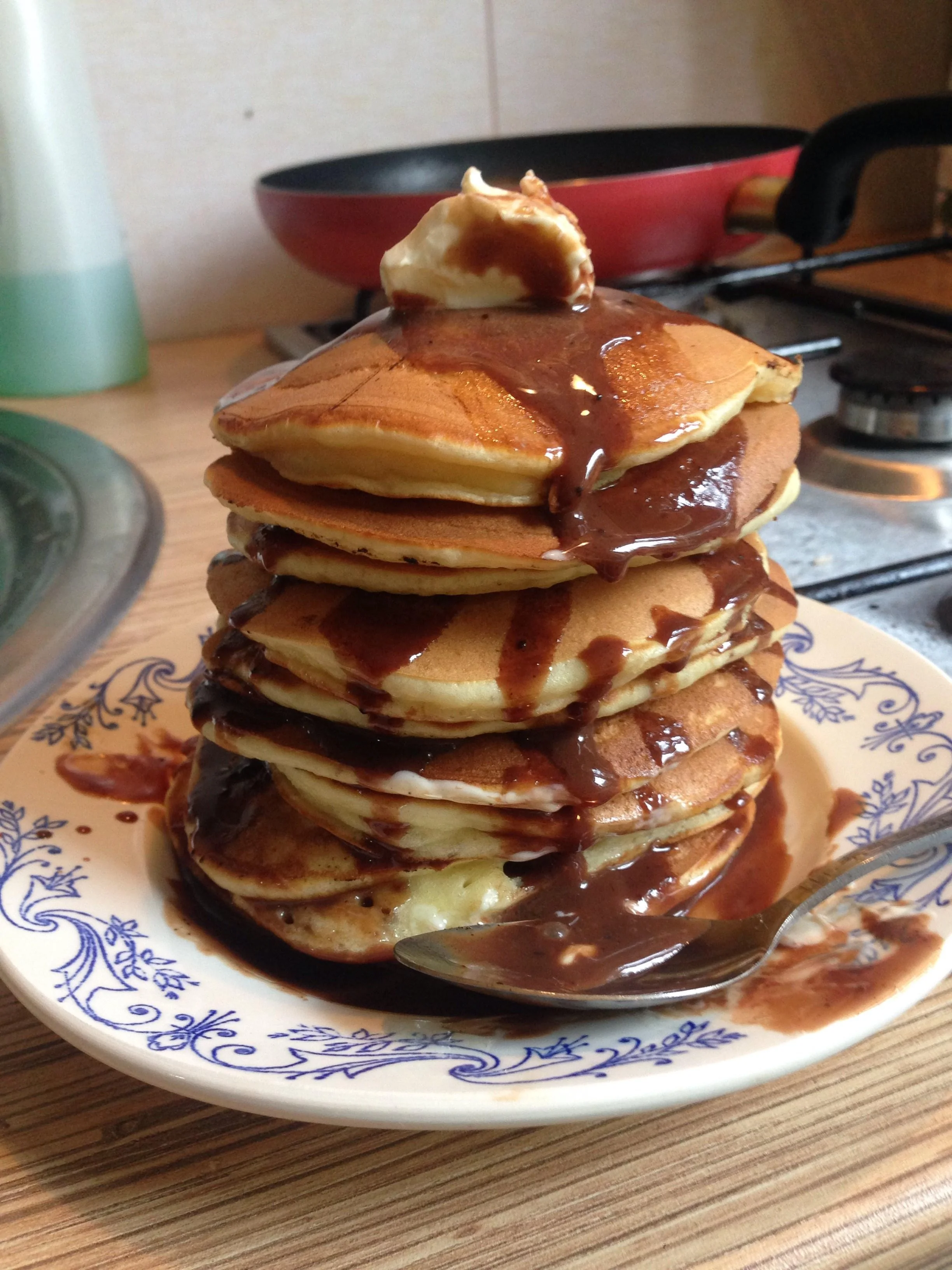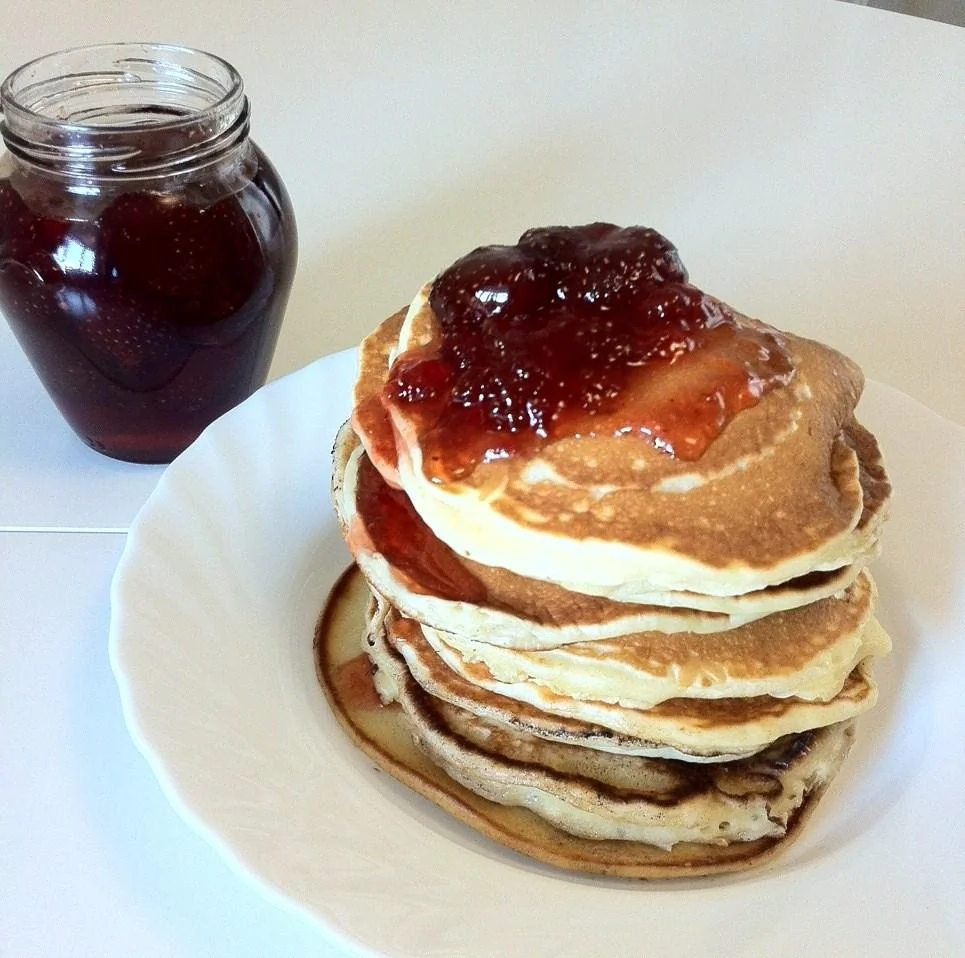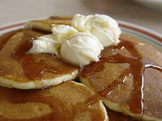 ШАГ 5 Сложите блины стопочкой и подавайте, положив сверху кусочки сливочного масла, шарики ванильного мороженого и щедро полив кленовым сиропом.
