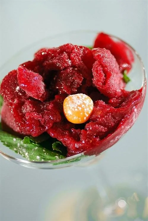 ШАГ 5 Вилкой перемешайте замороженную граниту и переложите в бокалы. Украсьте свежей малиной и сразу подавайте.