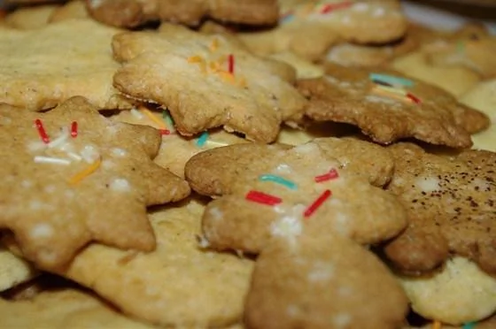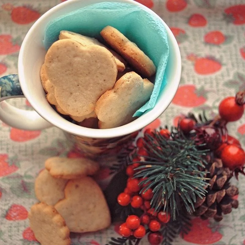 ШАГ 4 Присыпать стол мукой, выложить на него тесто и раскатать. Вырезать из теста печенье той формы, которая вам нравится. Присыпать сахаром или молотым миндалем.