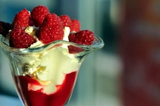 Санди из малины и ревеня со взбитыми сливками и грецкими орехами