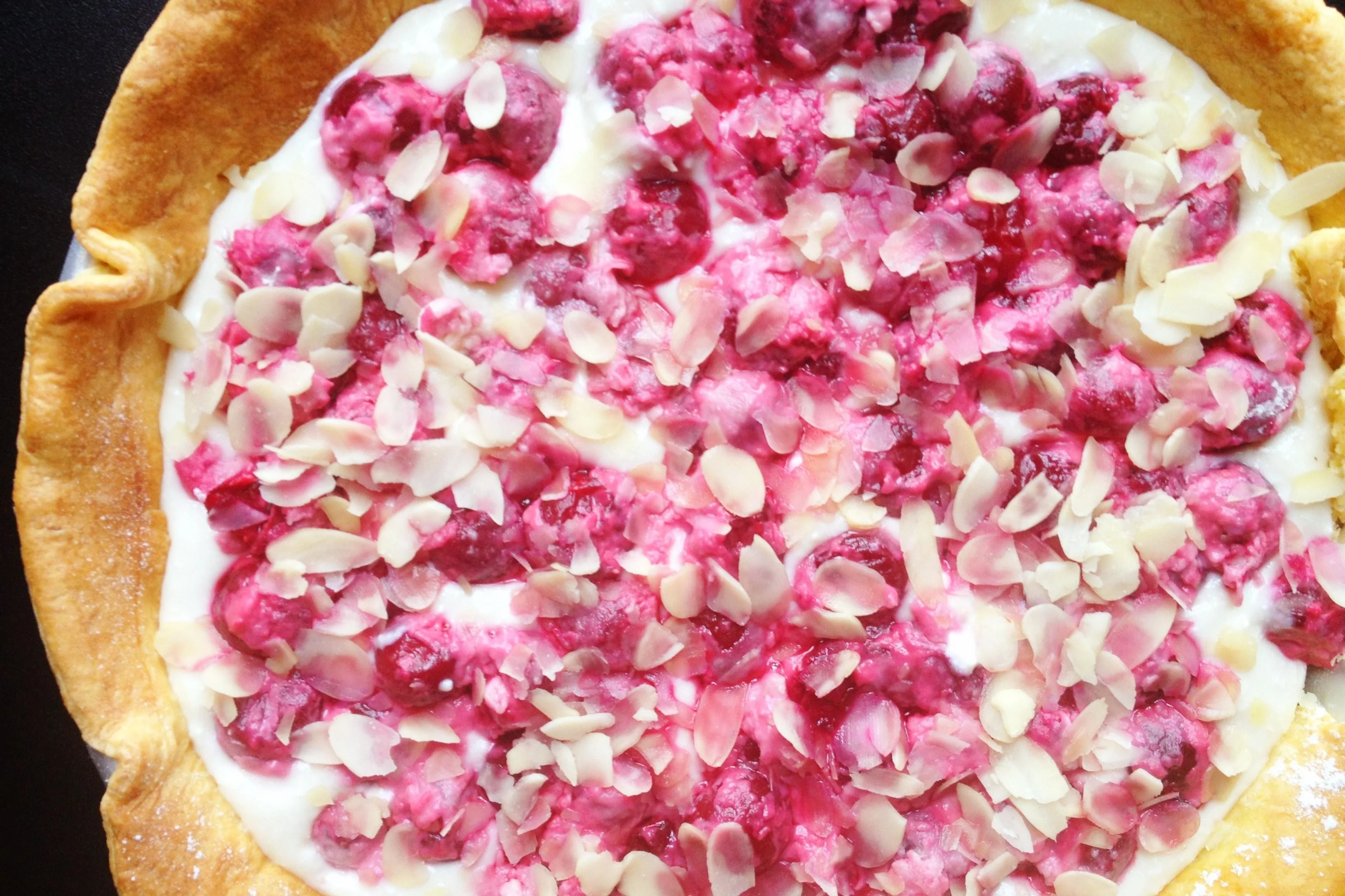 ШАГ 3 На остывший корж выливаем нашу начинку, вишню кладем в крем.