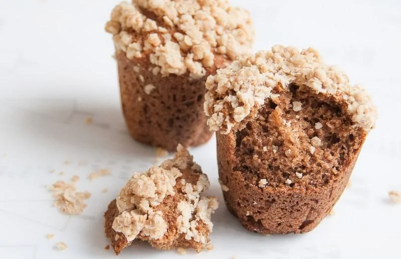 ШАГ 6 Растопить сливочное масло и смешать его с овсянкой, сахаром мусковадо, мелко нарезанными имбирными цукатами и двумя столовыми ложками муки. Щедро посыпать смесью маффины, немного прижать.