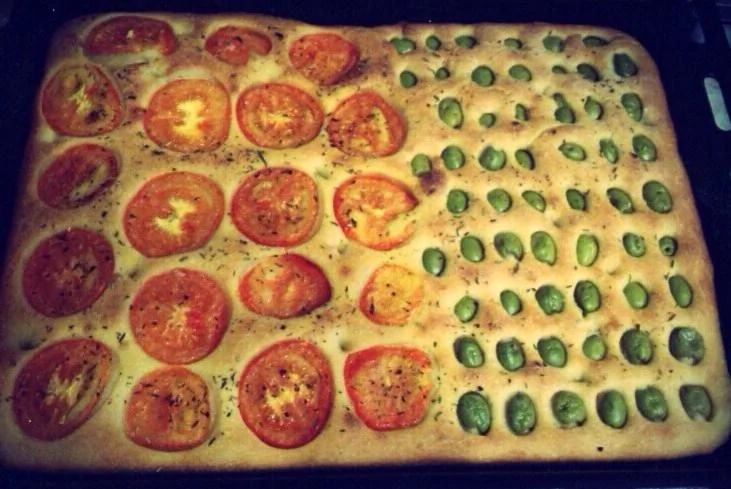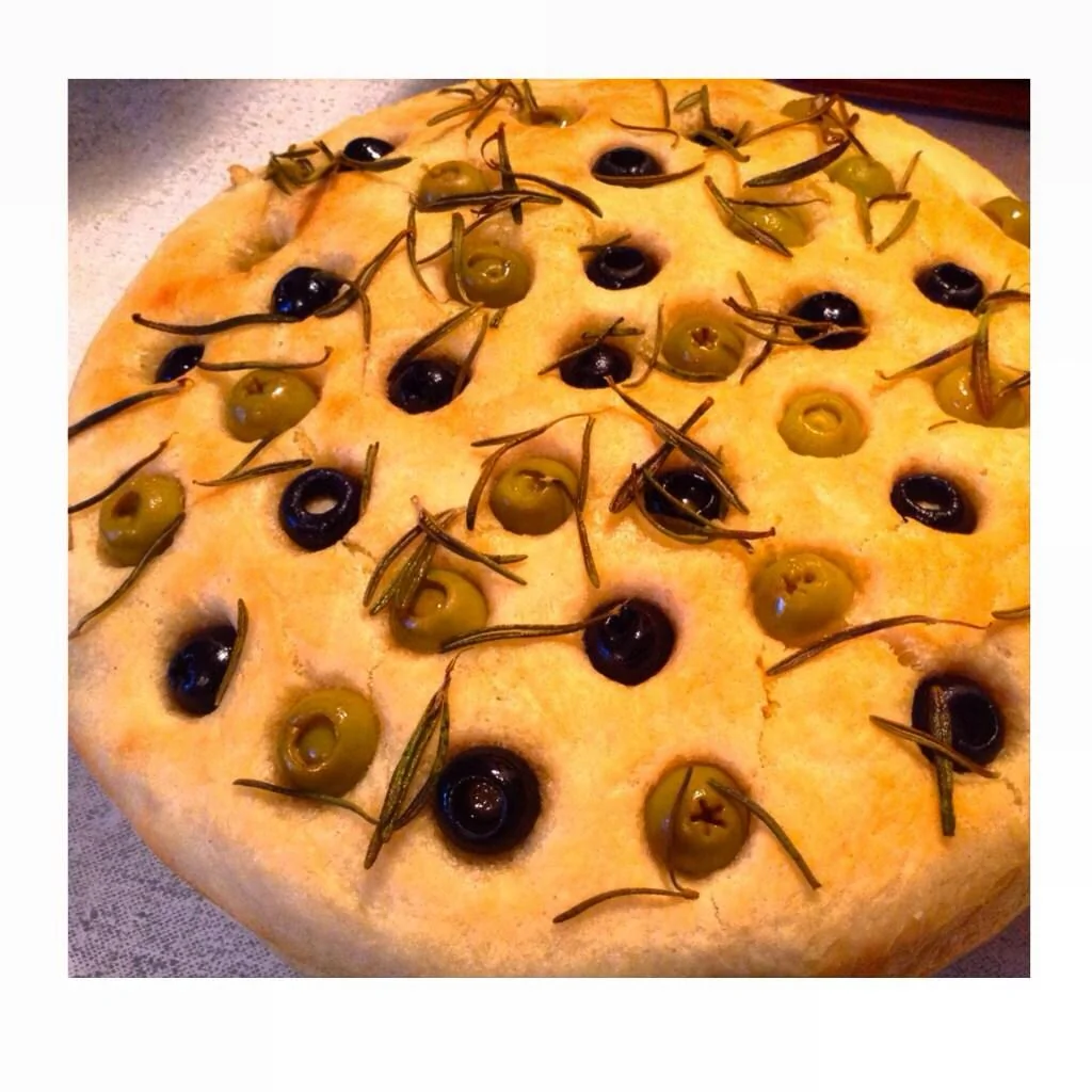 ШАГ 4 Смажьте сверху 2 ложками оливкового масла. Воткните разрезанные пополам оливки и посыпьте нарезанным розмарином. Оставьте фокаччу на 25 минут в теплом месте.