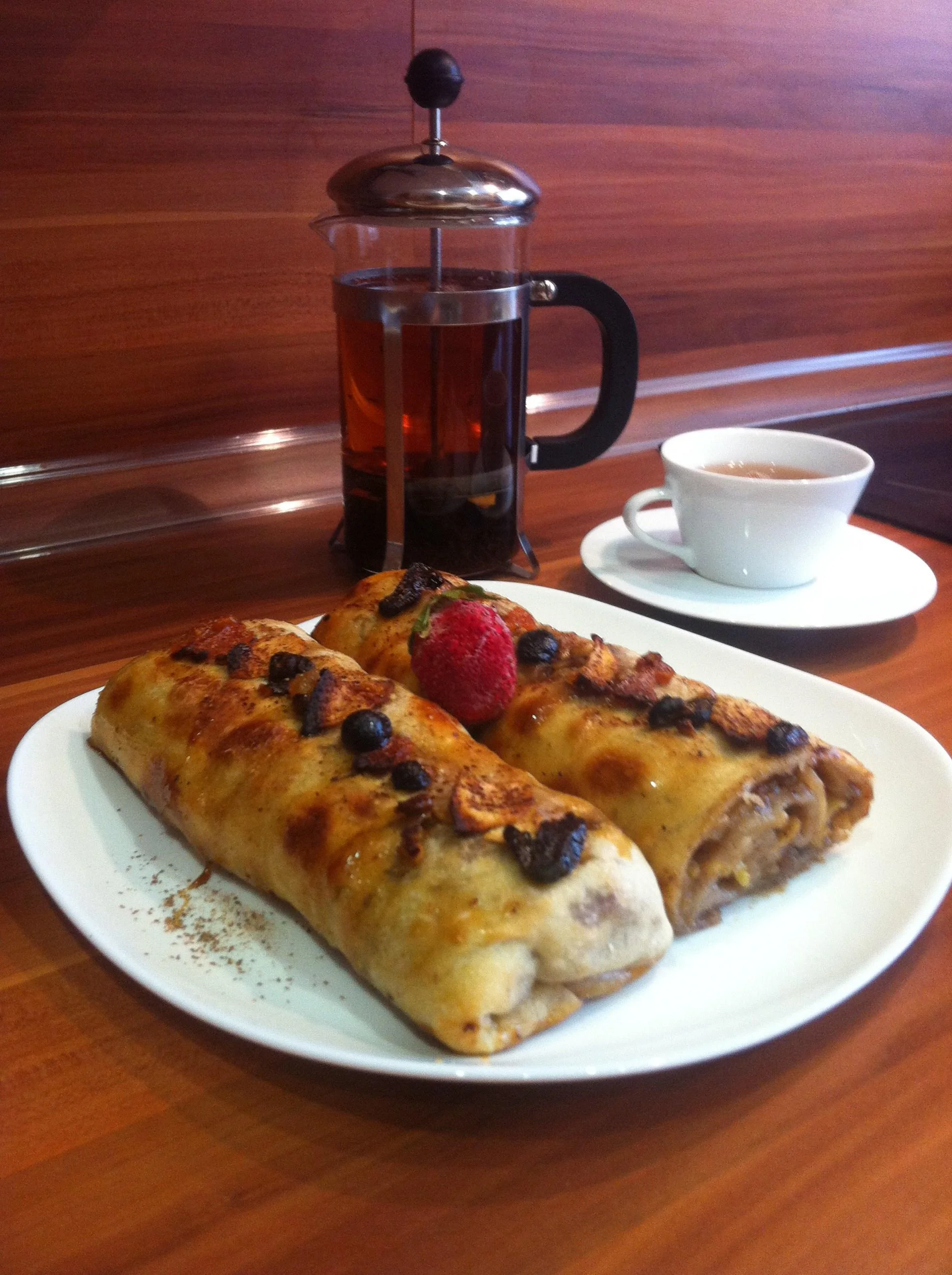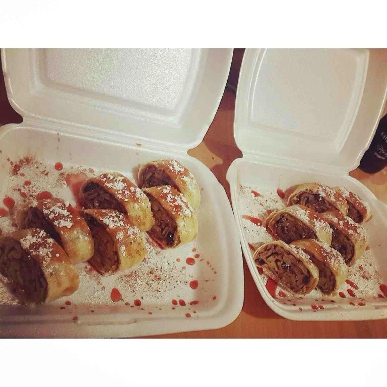 ШАГ 8 Тесто раскатать тонко-тонко, смазать оливковым маслом и подсластителем с внутренней стороны, ровным слоем выложить начинку и скатать рулет. Концы закрыть.