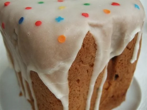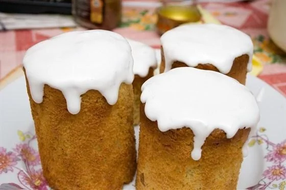 ШАГ 5 Полностью остывший кулич поставить вертикально на блюдо и покрыть глазурью из взбитого со стаканом сахарной пудры яичного белка.