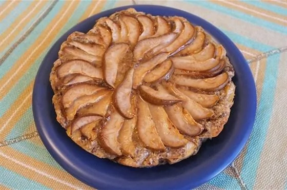 ШАГ 5 Разъемную форму для выпечки смазать растительным маслом, выложить в нее тесто. Лопаткой или силиконовым скребком разровнять поверхность. Выложить на тесто нарезанные груши по кругу узкой частью к центру и так, чтобы ломтики слегка находили друг на друга. Слегка прижать рукой.