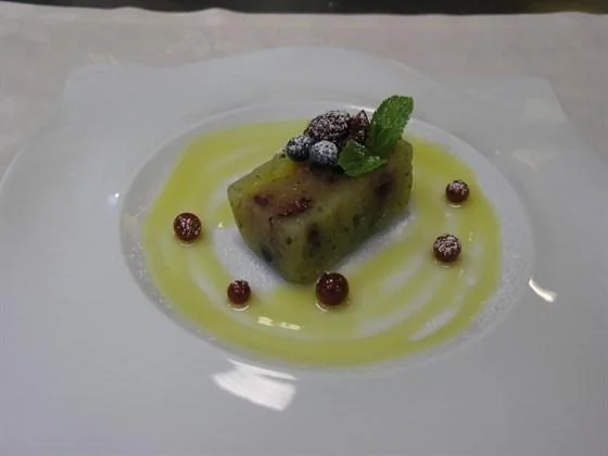 Террин из груши с красными ягодами под апельсиновым соусом