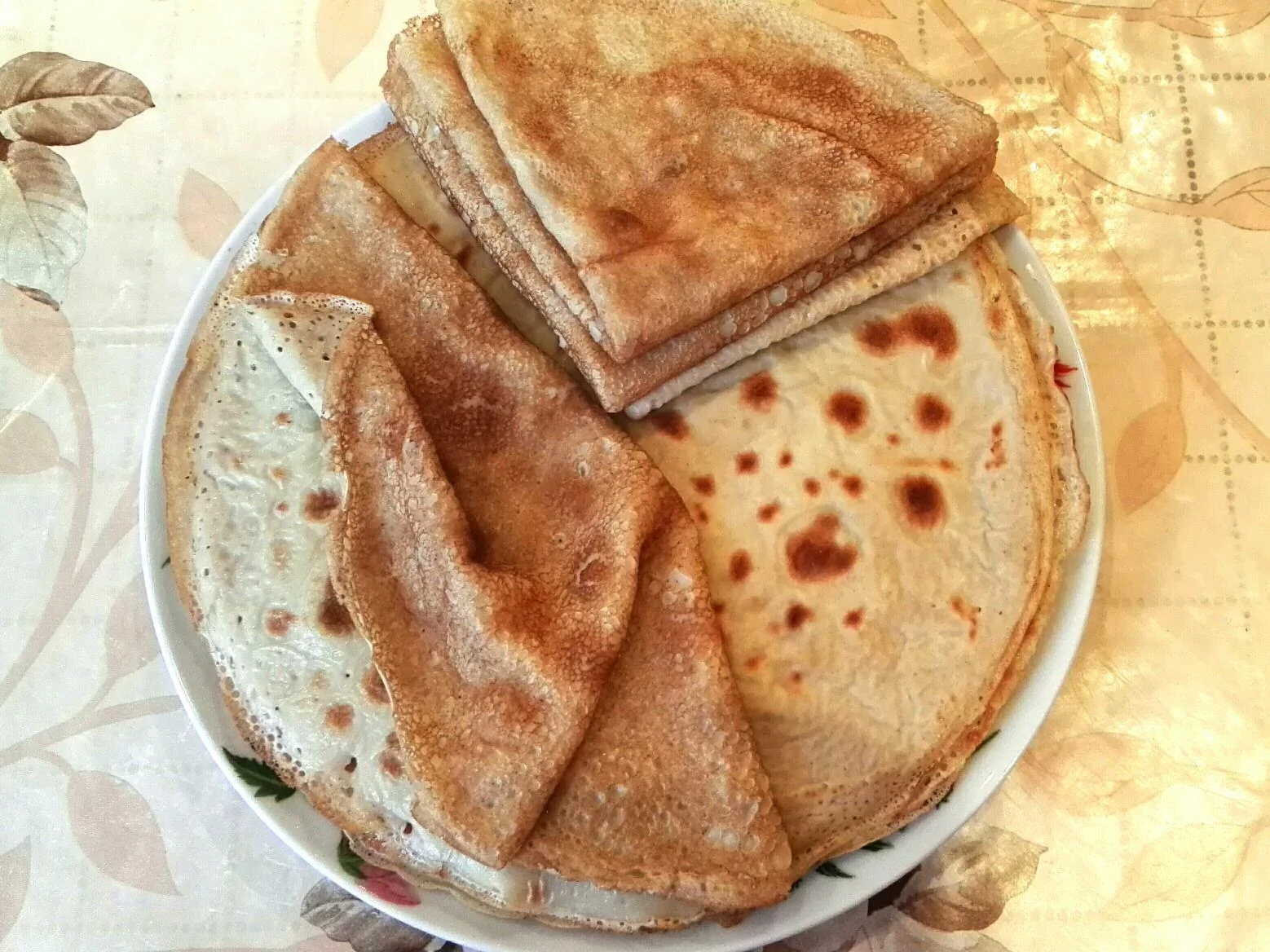 ШАГ 2 Блинную сковородку раскалить, смазать растительным маслом и пожарить на нем тонкие блинчики. Готовые блины сложить треугольником и подать с медом и вареньем.