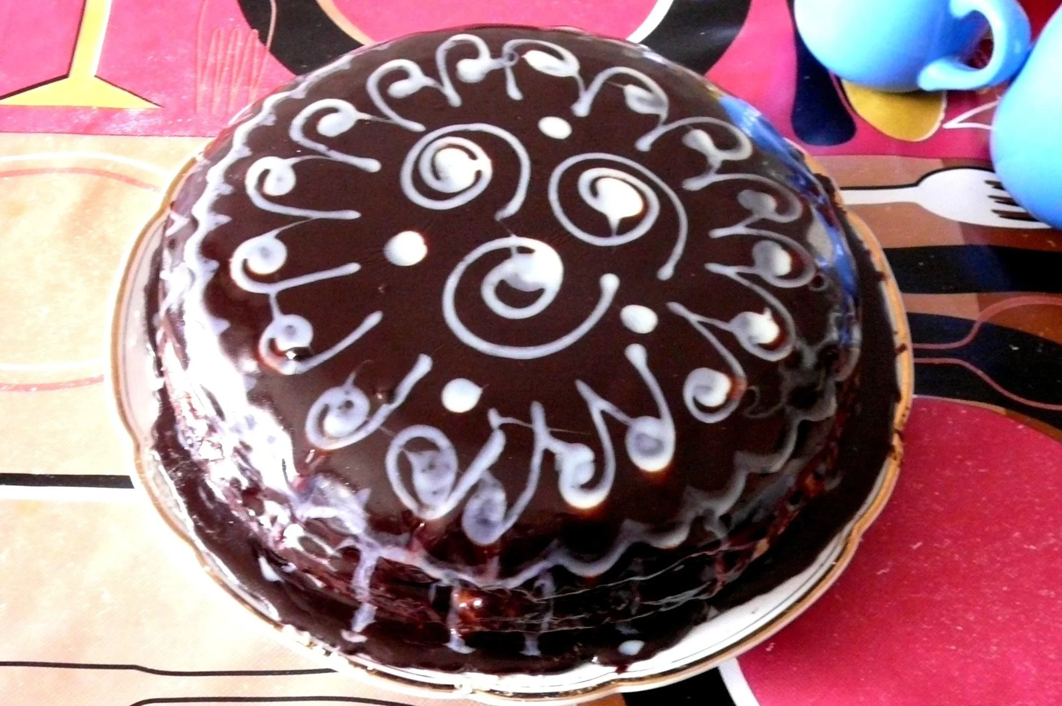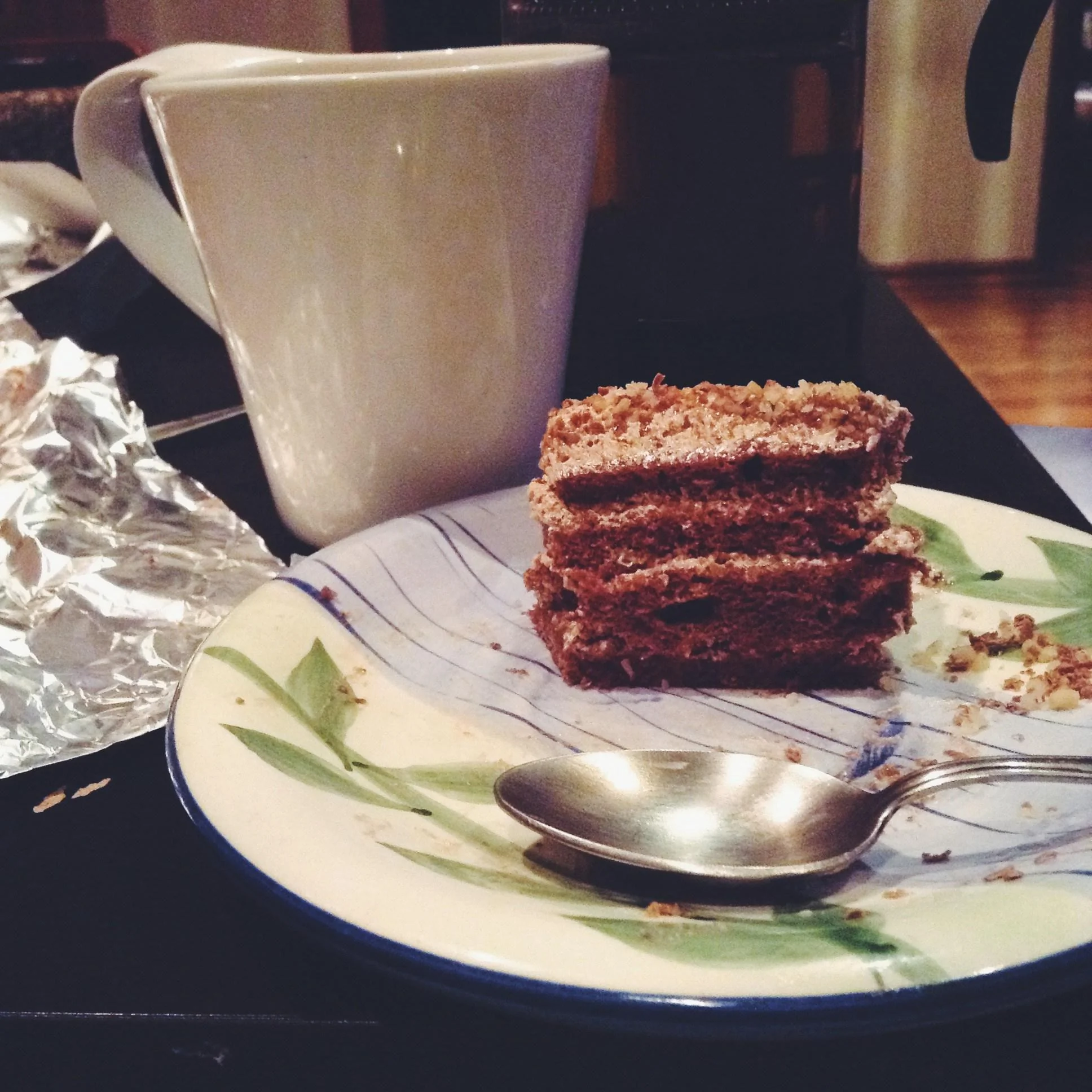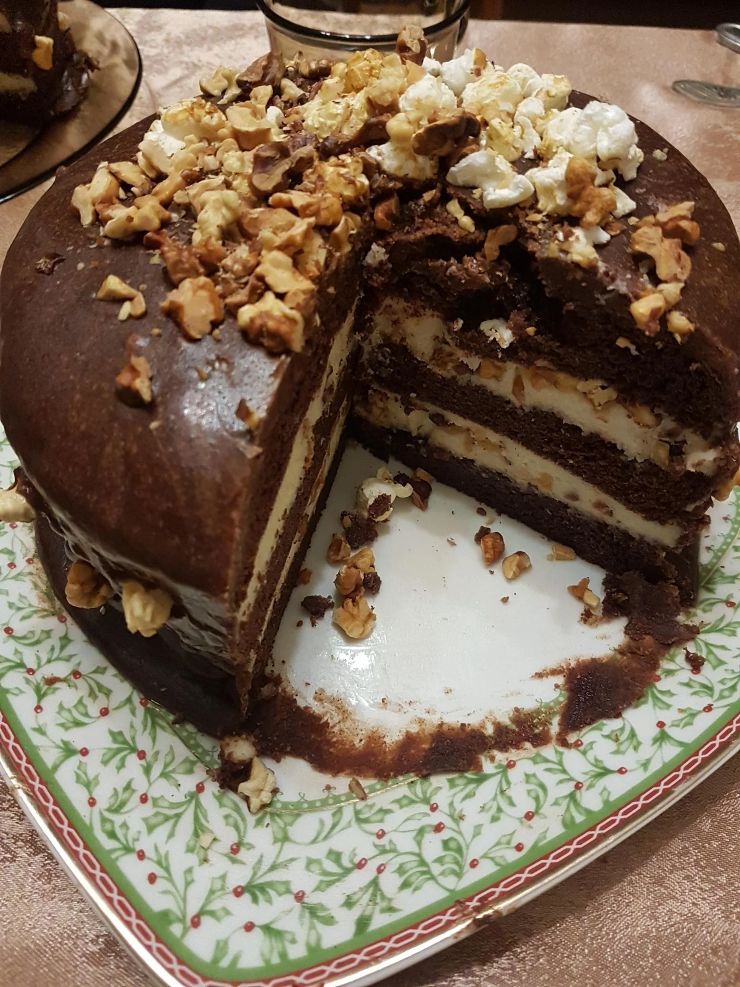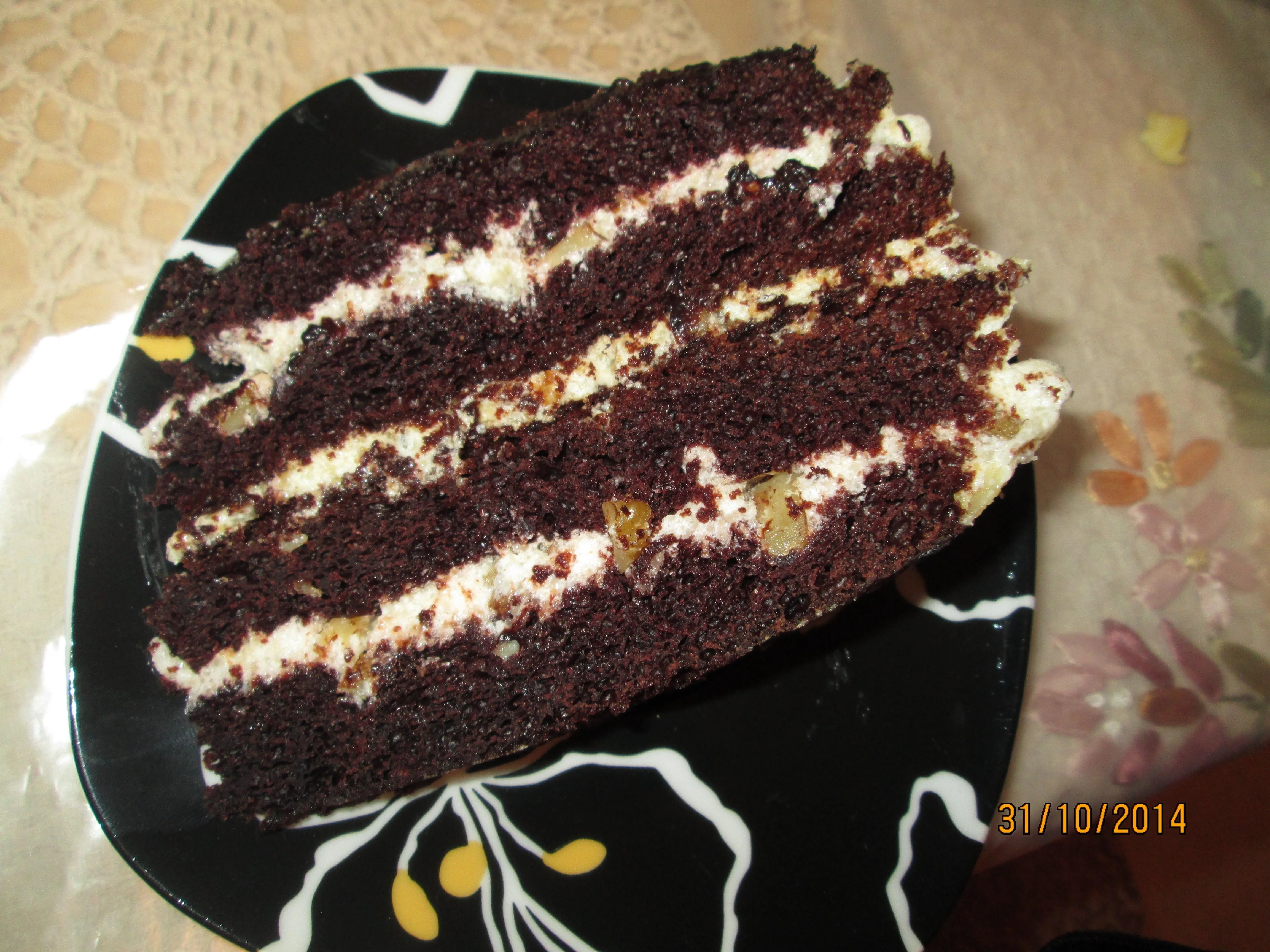 ШАГ 6 Достать коржи и разрезать каждый на 2 части. Каждый корж, кроме верхнего, намазать кремом и выложить на крем грецкие орехи. Верхний слой покрыть глазурью. Чтобы сделать глазурь, в кастрюльке нужно растопить 100 грамм сливочного масла, добавить 8 столовых ложек сахара, 2 столовые ложки молока и 2 столовые ложки какао. Помешивать минут 5. Вылить на торт и сразу размазать, т.к. быстро застывает!