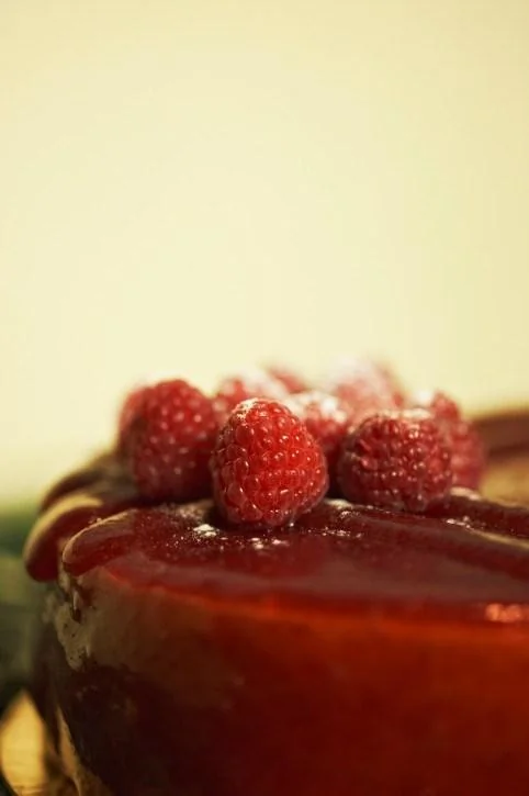 ШАГ 6 На готовый корж выложите малину и залейте шоколадным кремом. Оставьте на 30 минут, а затем поставьте в холодильник на 1,5 часа.