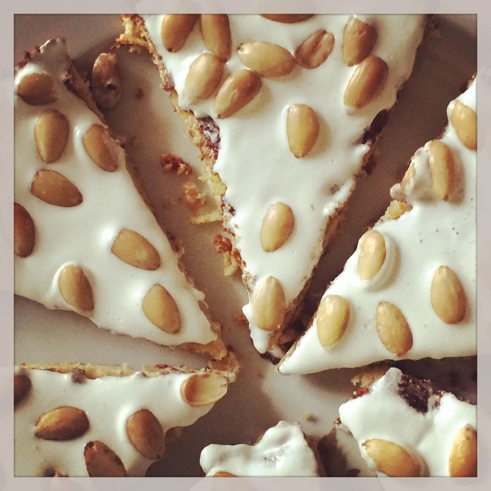 ШАГ 8 Просейте сахарную пудру и перемешайте с 2 столовыми ложками лимонного сока и миндальным ликером, чтобы получилась глазурь. Полейте пирог глазурью и посыпьте «миндальными лепестками».