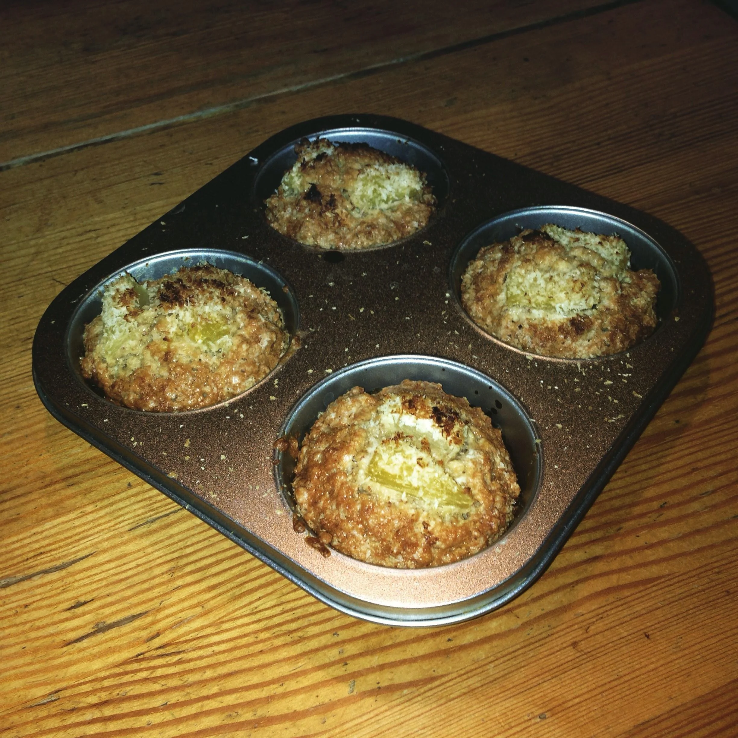 ШАГ 2 Выложить тесто в круглые формочки. Сверху положить кружочки ананаса. В центр пирожных положить кокосовую стружку.