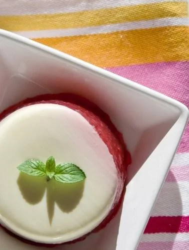 Молочный пудинг с лимоном и мятой и под малиновым соусом