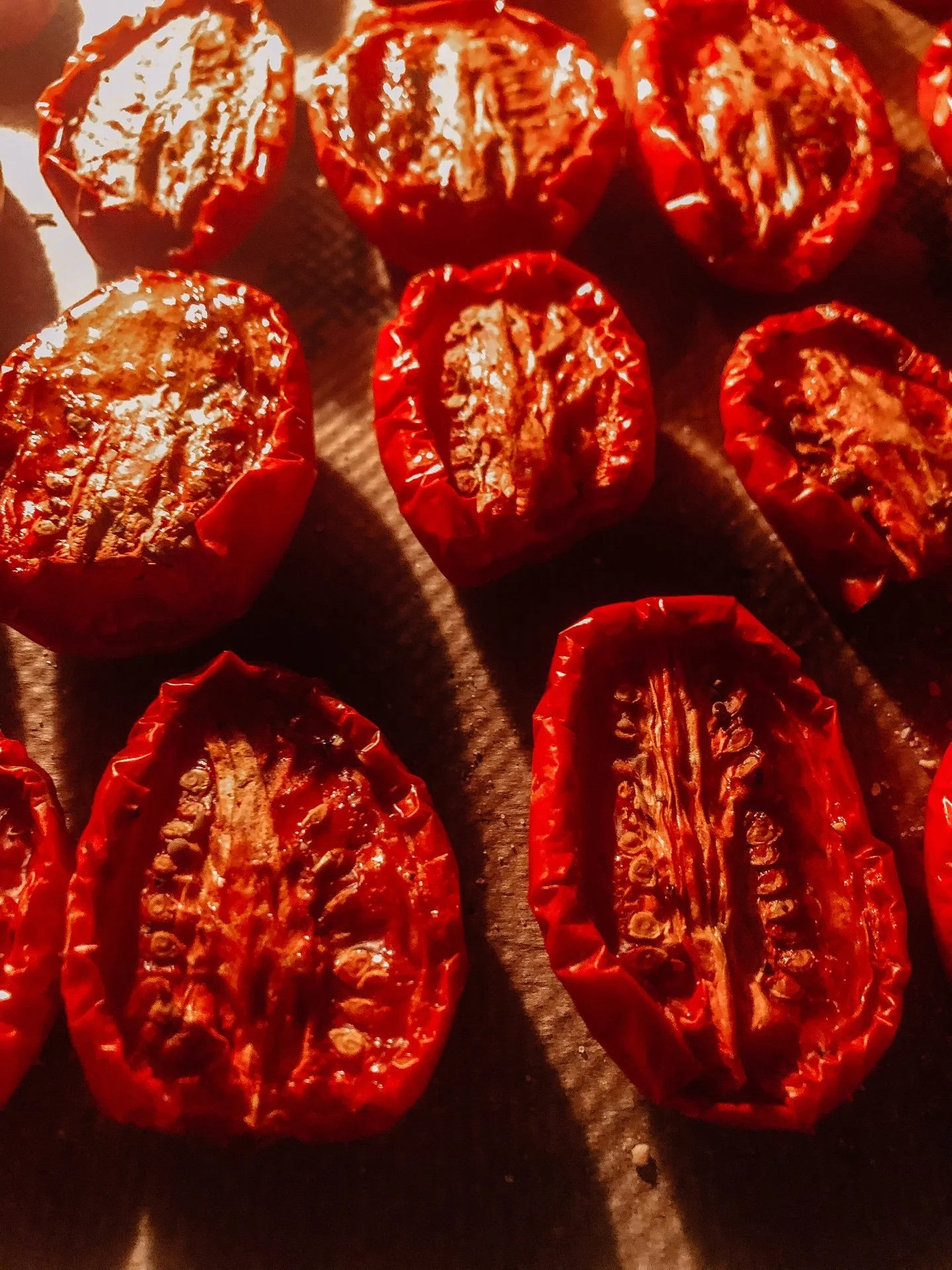 ШАГ 3 Полить помидоры оливковым маслом. Запекать при 150 градусах примерно 4–4,5 часа с приоткрытой дверцей в духовке.