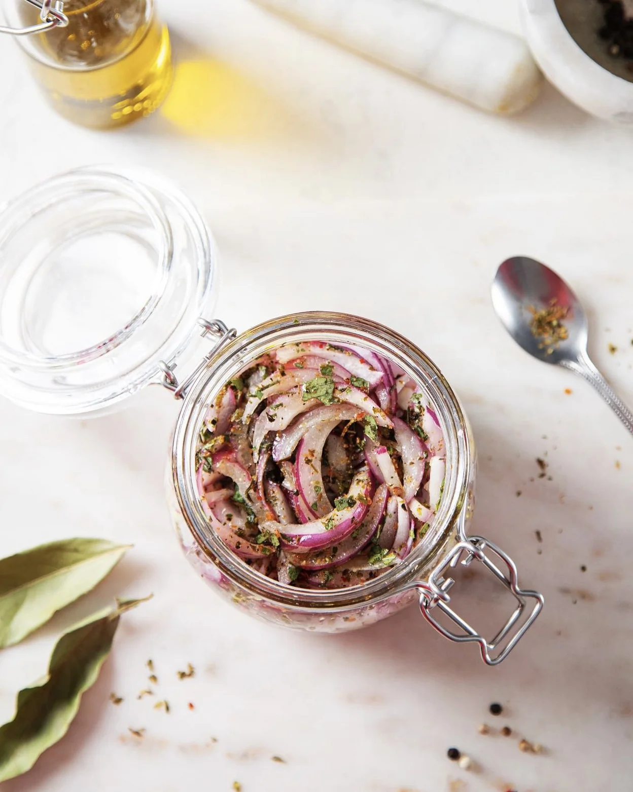 ШАГ 2 Лук выложить в банку слоями со специями, орегано, лавровым листом. Каждый слой придавливать и заливать смесью из уксуса и оливкового масла.