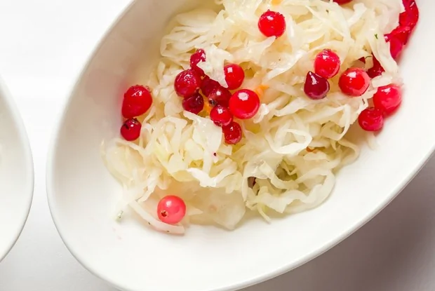 ШАГ 7 Выложить слоями капусту, виноград, сливу и морковь, сверху выложить клюкву.