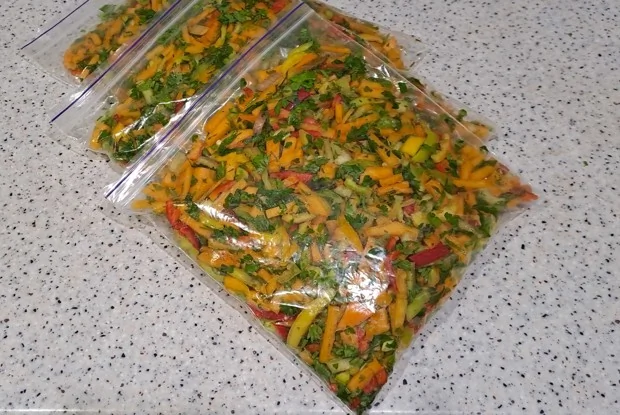 ШАГ 10 Наполненные овощной смесью пакеты переложить для хранения в морозилку. Смесь можно использовать при приготовлении овощных, мясных, первых блюд, а также омлетов и запеканок.