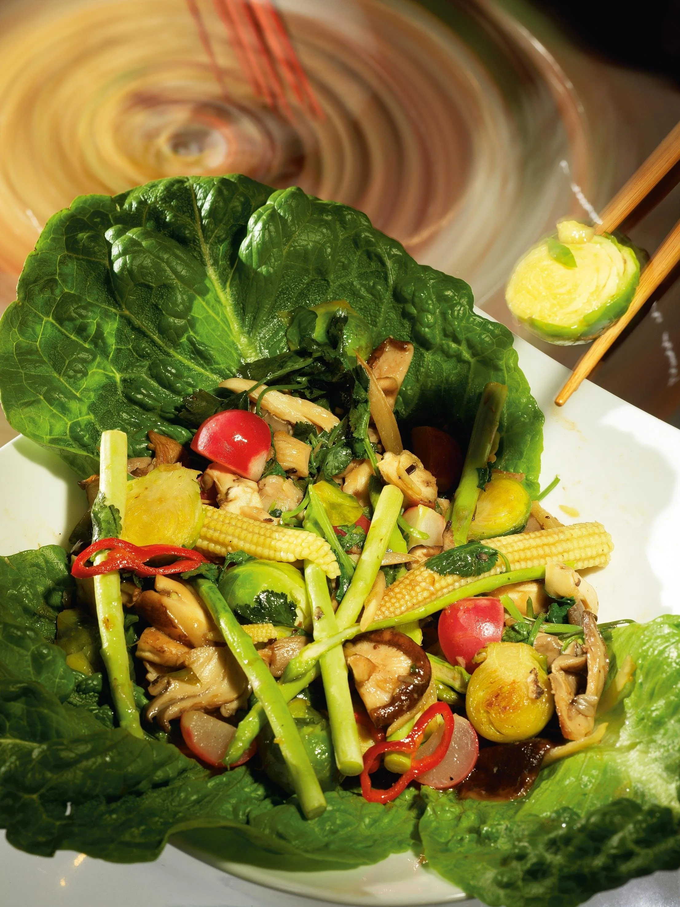 ШАГ 3 Капусту вынуть, обжарить в сковородке грибы, вынуть их и обжарить спаржу и кукурузу, вынуть, обжарить редис. Затем добавить в сковородку соевый и рыбный соусы, сок лайма, перемешать и вернуть в компанию к соусам остальные овощи и крупно нарубленную кинзу, перемешать, потушить минуту-другую и подавать.