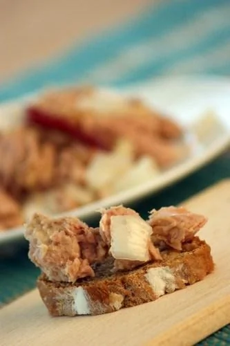 ШАГ 2 Обсушите тунца, положите в миску и разомните вилкой. Добавьте майонез и хорошо перемешайте. Выложите смесь на хлеб.