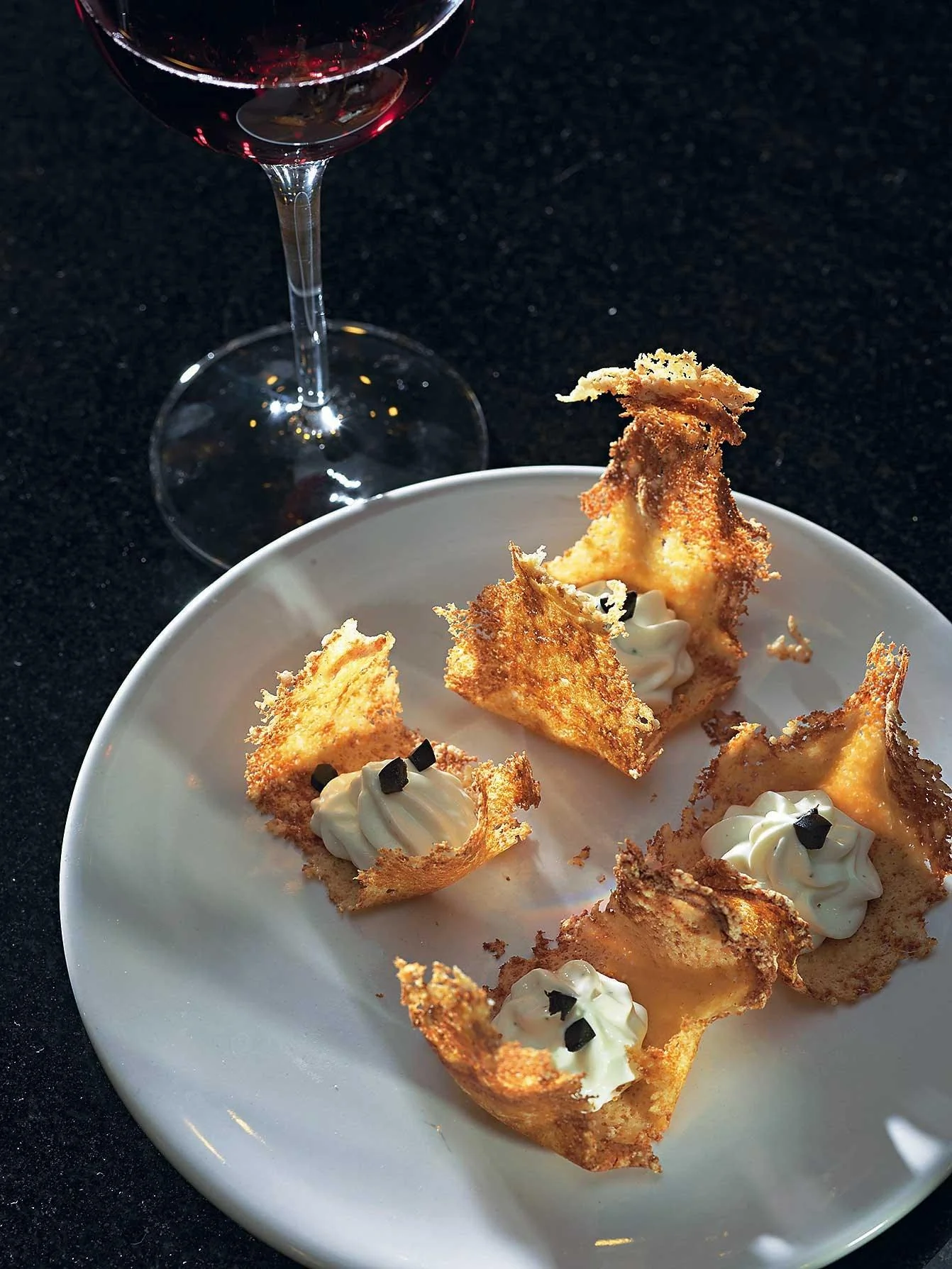 ШАГ 4 Наполнить сырной массой кондитерский рожок и выдавить им на пармезанные кружева по небольшому шарику. Нарубить маленькими кубиками черные оливки и ими украсить нехитрую композицию.