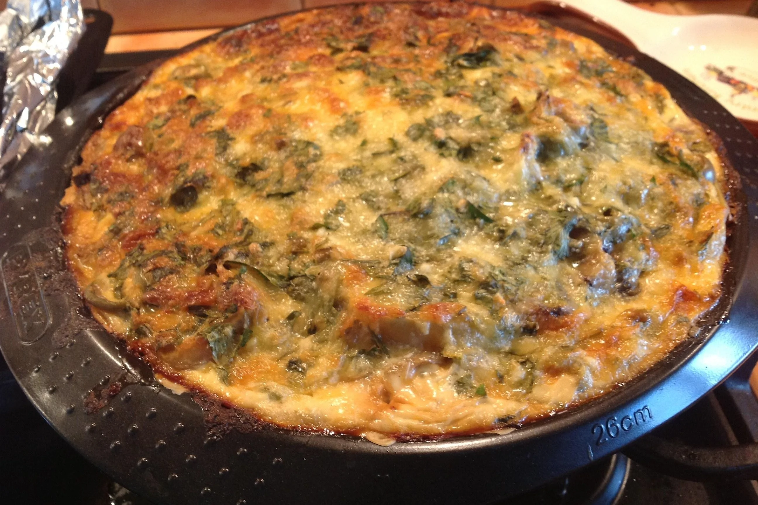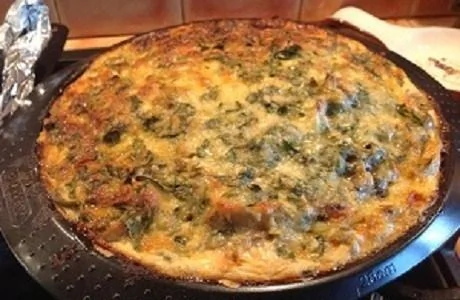 ШАГ 4 Приготовить заливку: взбить яйца, сметану, молоко и сыр, добавить чеснок (пропущенный через чеснокодавилку) и горсть мелко нарубленной зелени (петрушка, майоран, базилик, душицу).