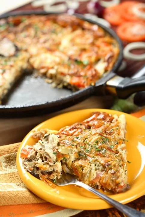ШАГ 6 Равномерно полить овощи заливкой. Запекать в духовке при темп 180 гр С около 50-60 мин. (или до золотистого цвета). Подавать к столу можно как в теплом, так и в холодном виде с сильно охлажденным белым или розовым вином.