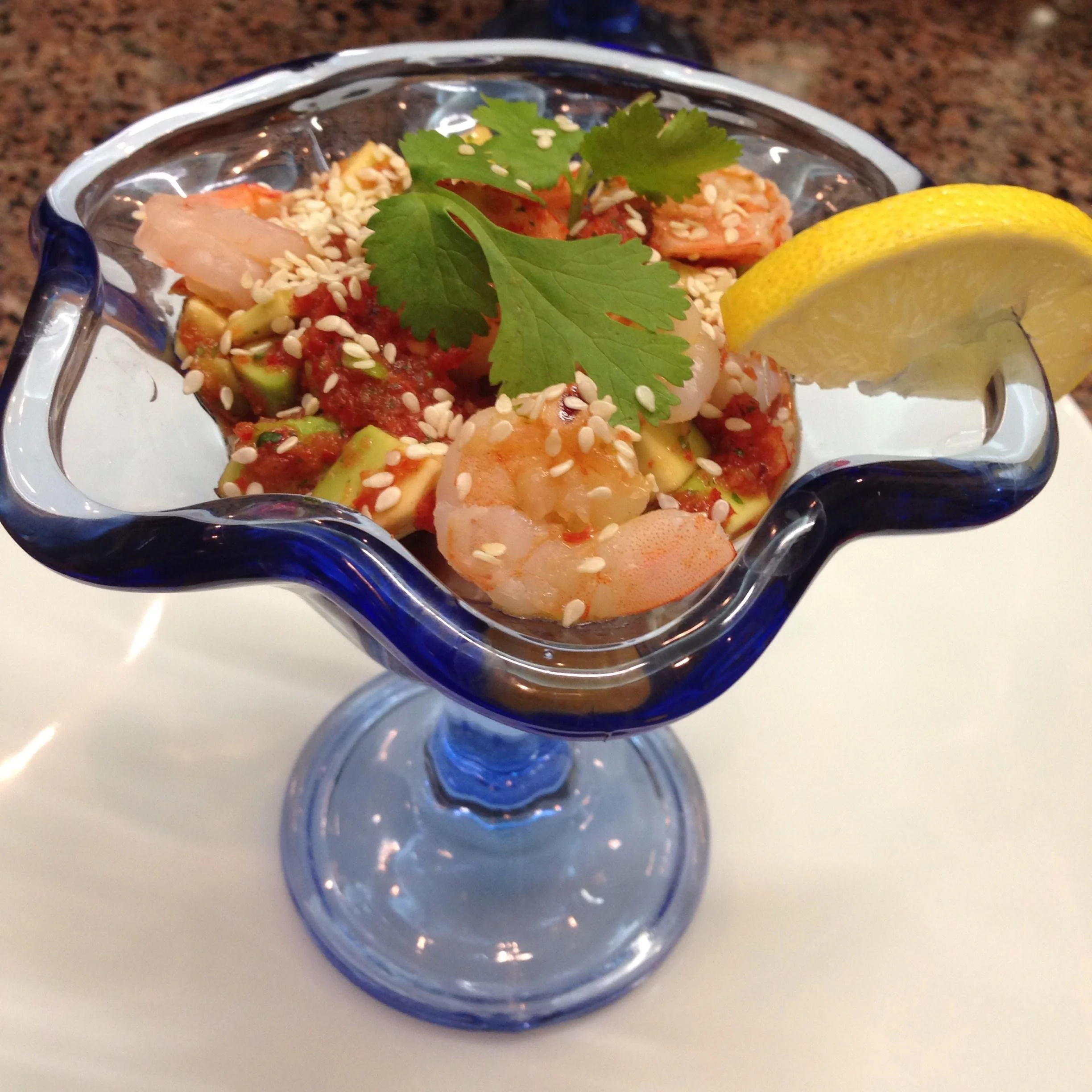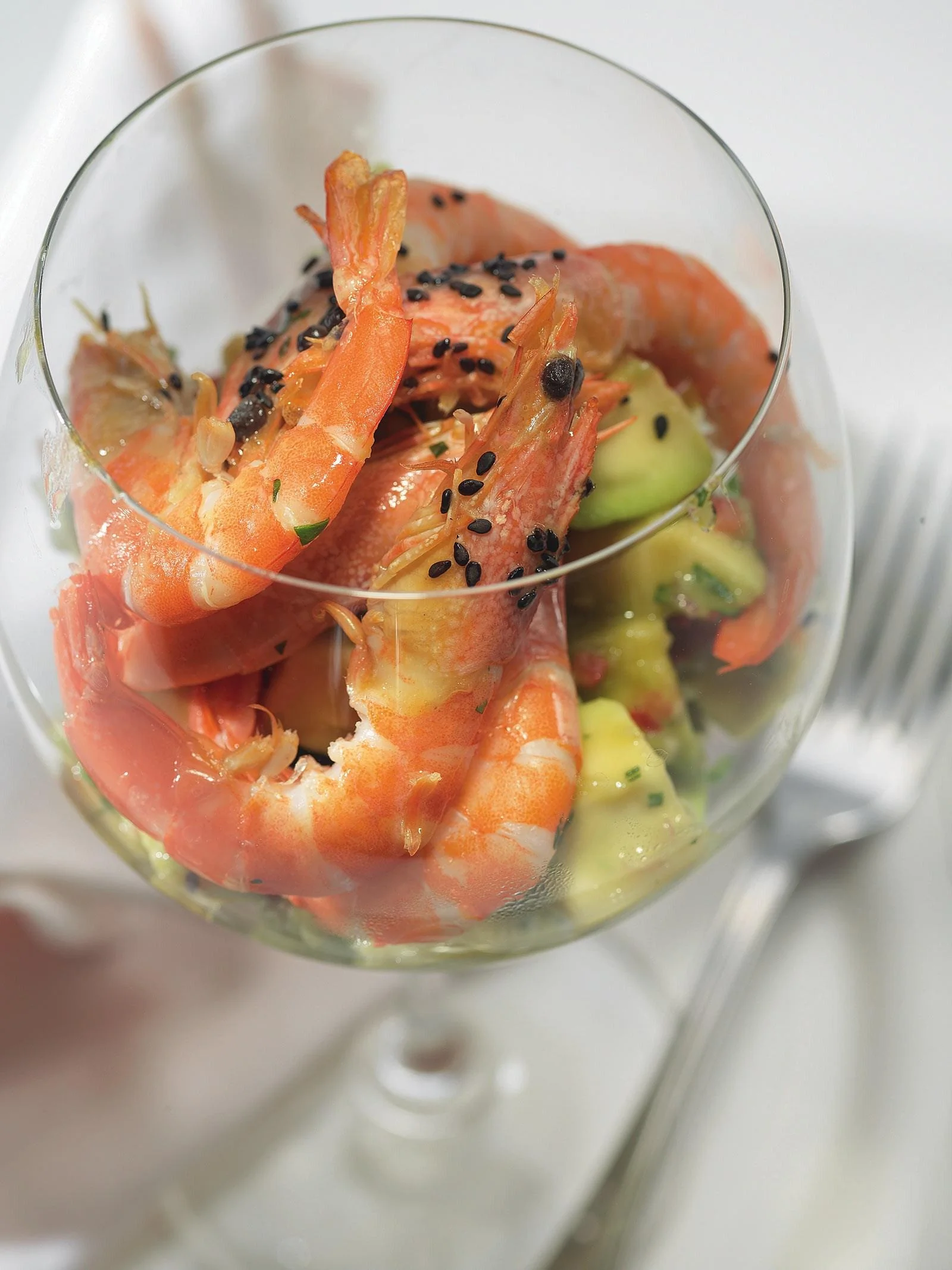 ШАГ 6 Сложить в миску авокадо, посыпать овощами и заправить соусом. Перемешать. Подавать, выложив сверху креветки. Креветки тоже можно чуть полить соусом и посыпать кунжутными семечками.