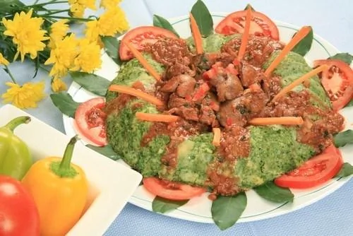 ШАГ 2 Лук измельчить обжарить до золотистого цвета на растительном масле. Добавить печень и обжарить. Влить вино и томатный сок. Оставить на большом огне до выпаривания жидкости. Посолить, поперчить и посыпать рубленой зеленью.