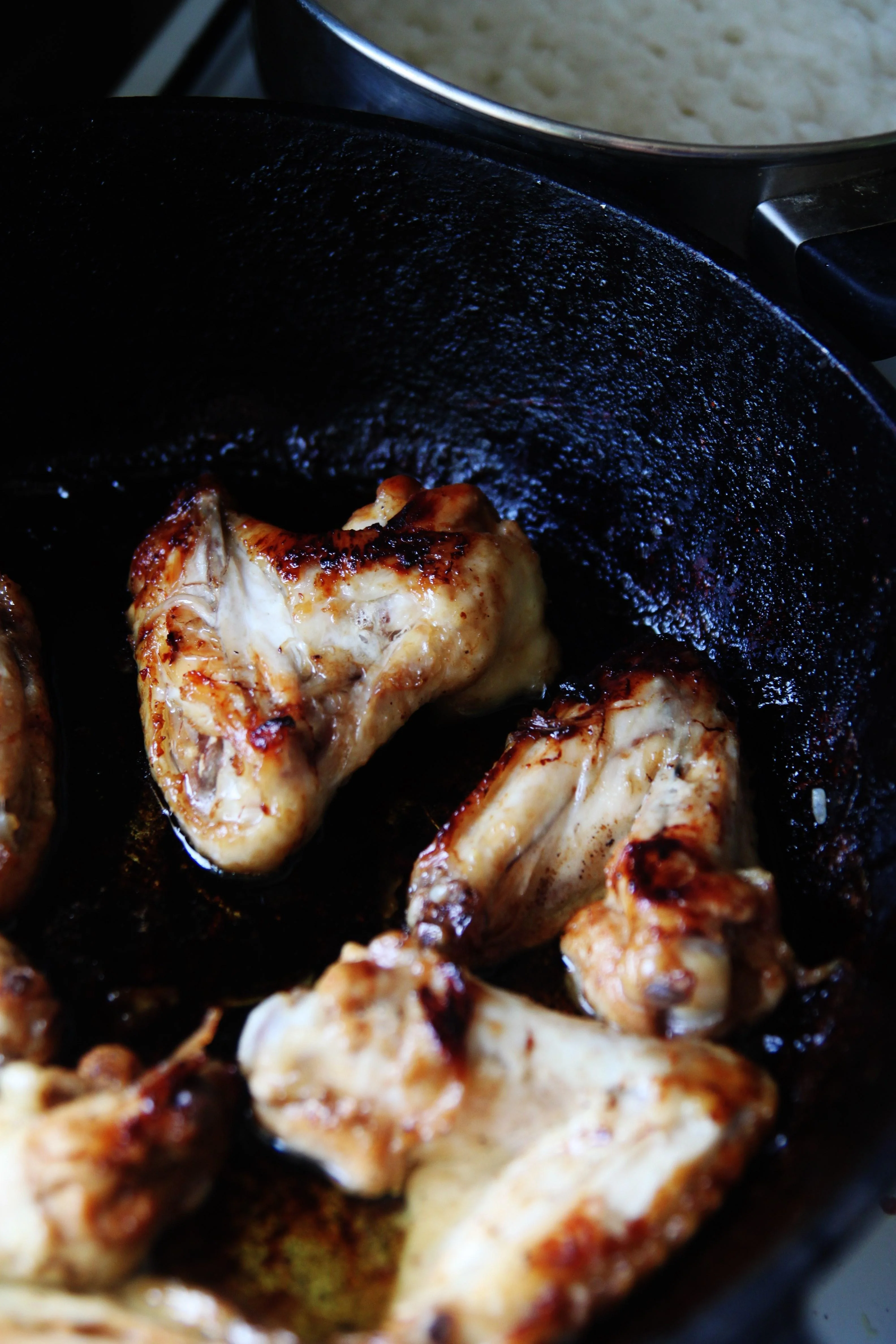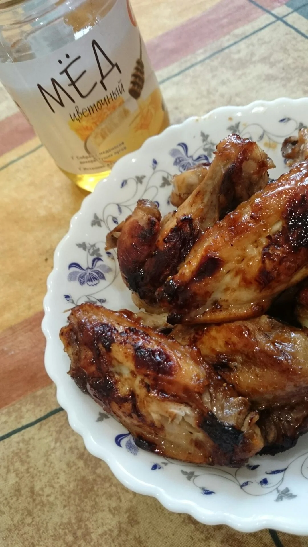 ШАГ 1 Крылышки помыть, обсушить и обжарить на растительном масле с солью и перцем. Затем добавить мед, соевый соус и обжарить на сильном огне крылышки.
