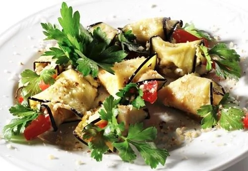 Рулеты из баклажанов с вялеными томатами, прошутто и моцареллой