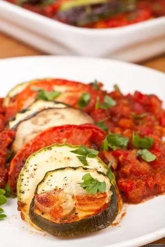 ШАГ 2 Порежьте цукини и помидоры кружочками и выложите, чередуя, в огнеупорную форму, ставя их боком друг к другу. Сбрызните оливковым маслом и посыпьте измельченным чесноком и тимьяном.