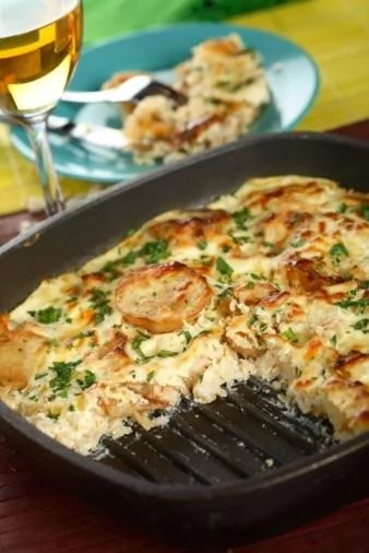 ШАГ 3 Выложите слой картофеля в смазанную маслом форму, сверху залейте небольшим количеством соуса, посыпьте тертым сыром и тимьяном. Повторите слои 2-3 раза, закончив соусом с сыром и тимьяном.