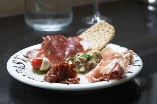 ШАГ 1 На каждую тарелку выложите по 3 вяленых помидора, по паре кусков пармезана, по ложке оливок, маслин и грибов, немного артишоков и 3 ломтика прошутто. Немного сливочного масла и пару анчоусов, слегка сбрызнув их трюфельным маслом.
