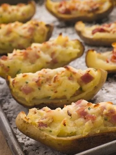Печеные половинки картофеля с начинкой из сыра, ветчины и зеленого лука