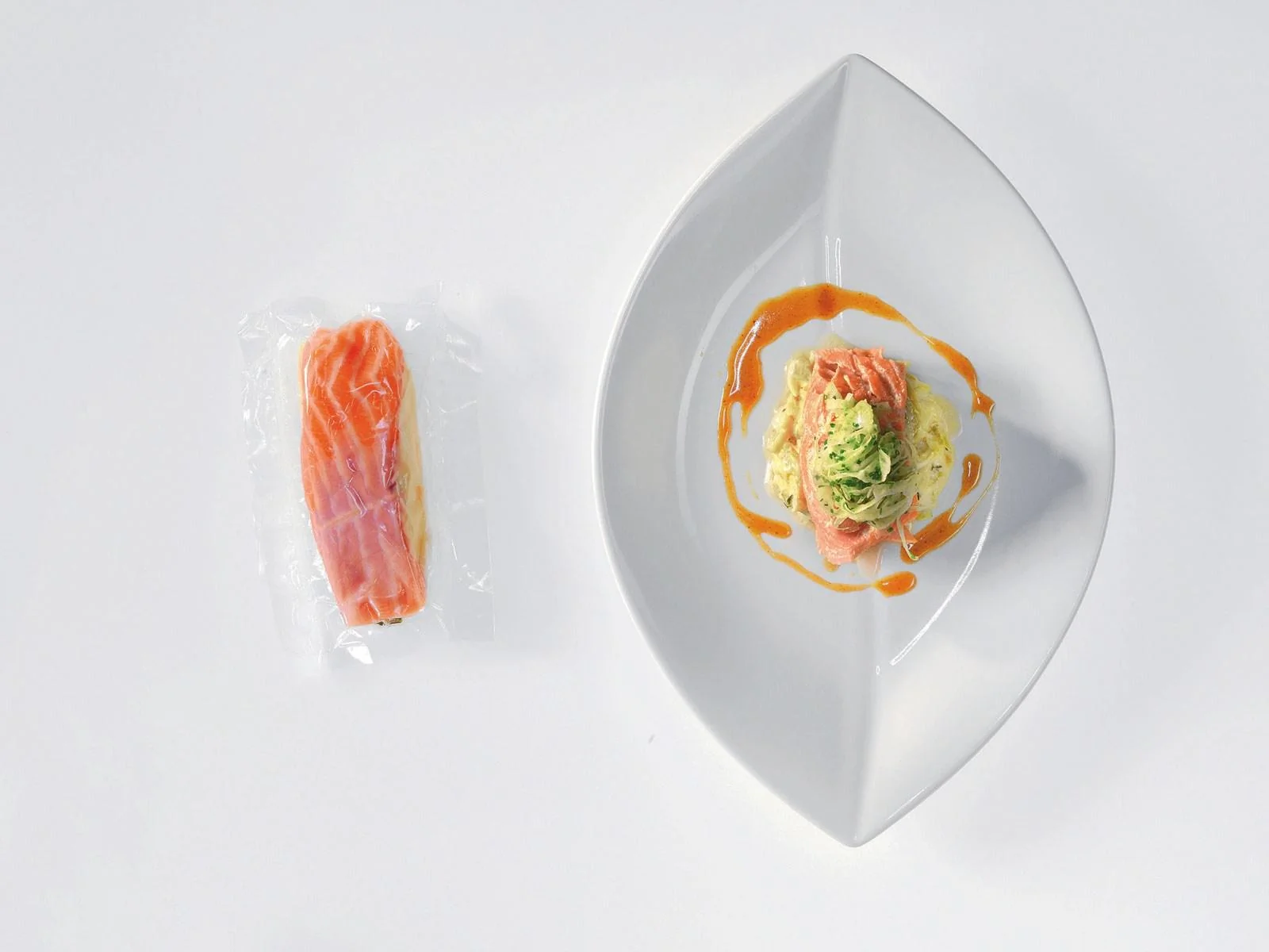 ШАГ 1 Посолить, поперчить рыбу и завакуумировать ее с 15 граммами масла, парой веточек тимьяна и ломтиком лимона. Довести воду до температуры 59,5 градусов и положить в нее пакет с рыбой на одиннадцать минут.