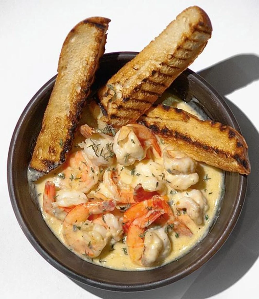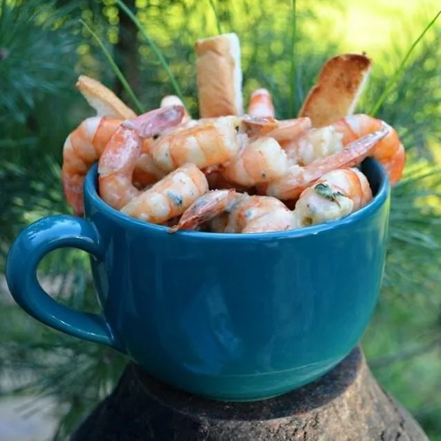 ШАГ 4 Разрезать треть багета на длинные четвертины, обжарить их на сковороде-гриле и подавать с креветками.