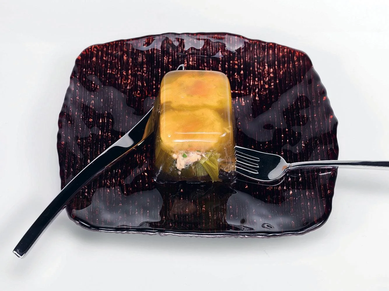ШАГ 7 В полулитре бульона развести желатин, остудить. Взять несколько маленьких форм и налить немного бульона в каждую. Дать ему застыть в холодильнике, затем в каждую положить куски нарезанного рыбного рулета (резать его с огромной аккуратностью острым ножом), залить до краев формы бульоном и еще минут на пятнадцать-двадцать поставить в холодильник.