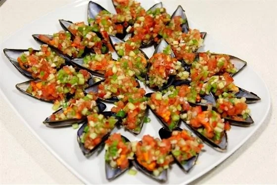 ШАГ 5 Охлаждённые мидии разложите на большом блюде и сверху залейте овощной шубой.