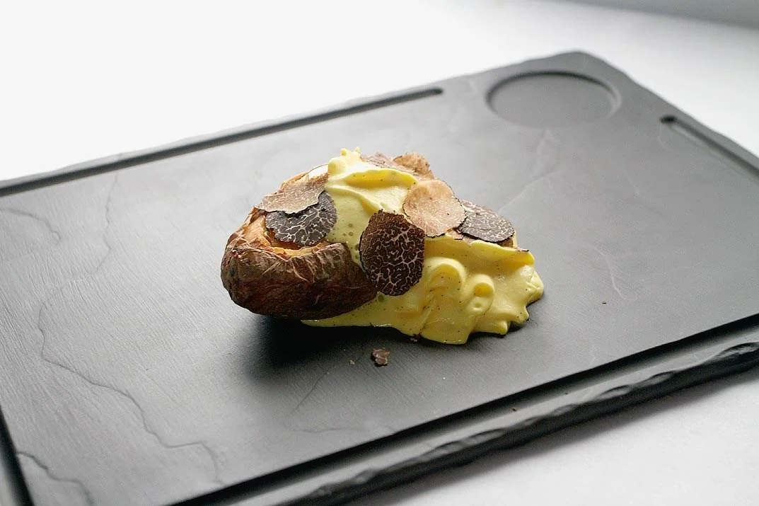 ШАГ 4 Подавать теплое суфле в картофельных формочках, добавив холодную ванильную пену и тонкие ломтики белого трюфеля.