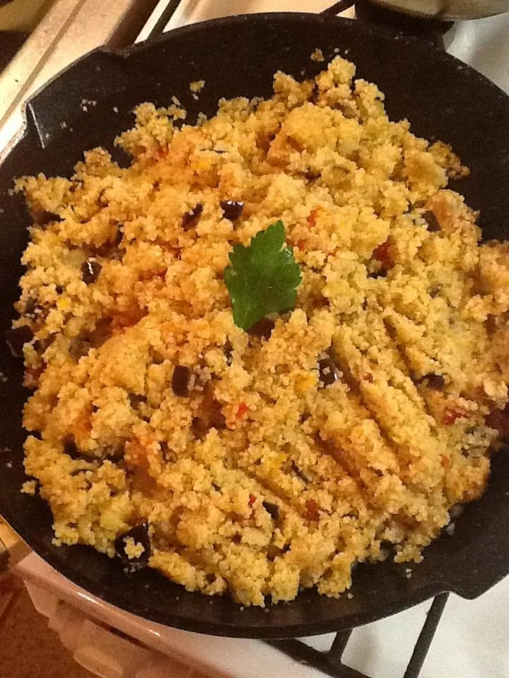 ШАГ 3 Мелко нарезать кабачок и баклажан (кубиками со стороной полсантиметра), обжарить на сковороде на растительном масле. Переложить в кастрюлю с кускусом.