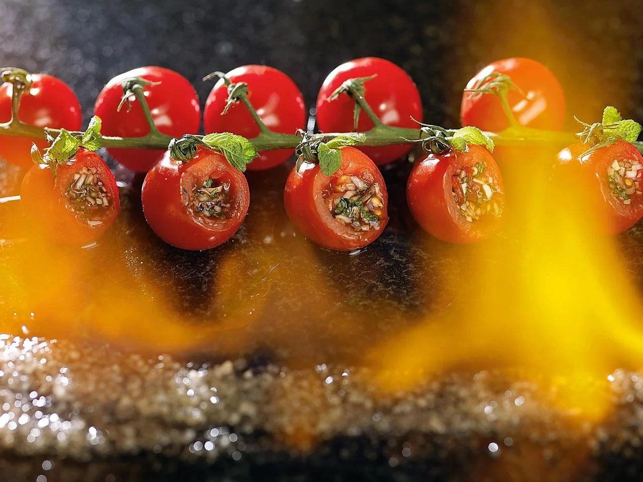 ШАГ 2 Помидоры черри аккуратно вымыть, не отрывая их от ветки. Очень острым ножом срезать каждой помидорине бок — чтобы получилось что-то вроде дупла. Маленьким ножом вырезать через отверстие внутренности помидоров, порубить их и тоже добавить к соусу. Снова перемешать и нафаршировать им томаты. Подавать через десять минут.
