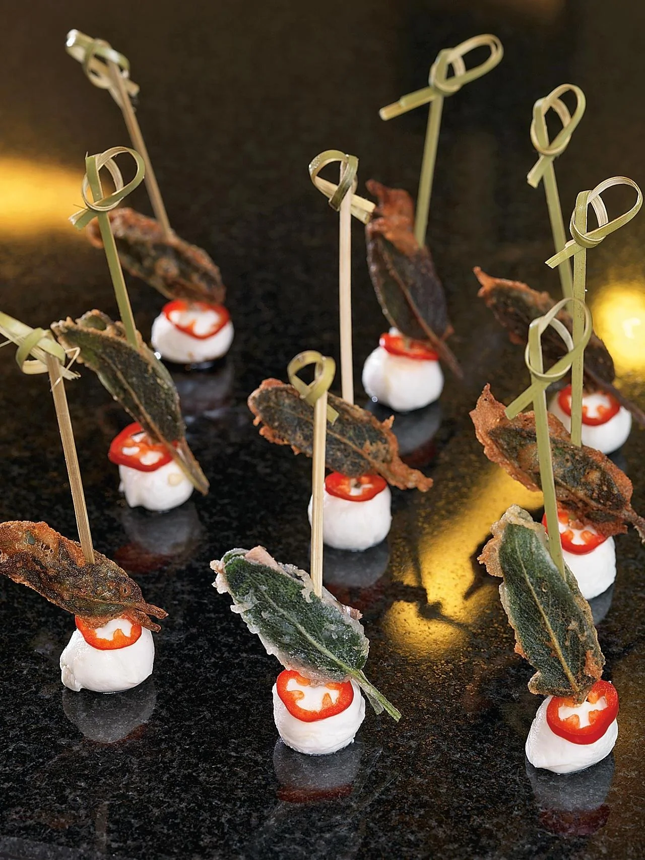 ШАГ 4 На шарики моцареллы положить по тонкому колечку перца чили — впрочем, без него можно и обойтись — и насадить сверху анчоусы с помощью зубочисток или шпажек. Подавать блюдо горячим.