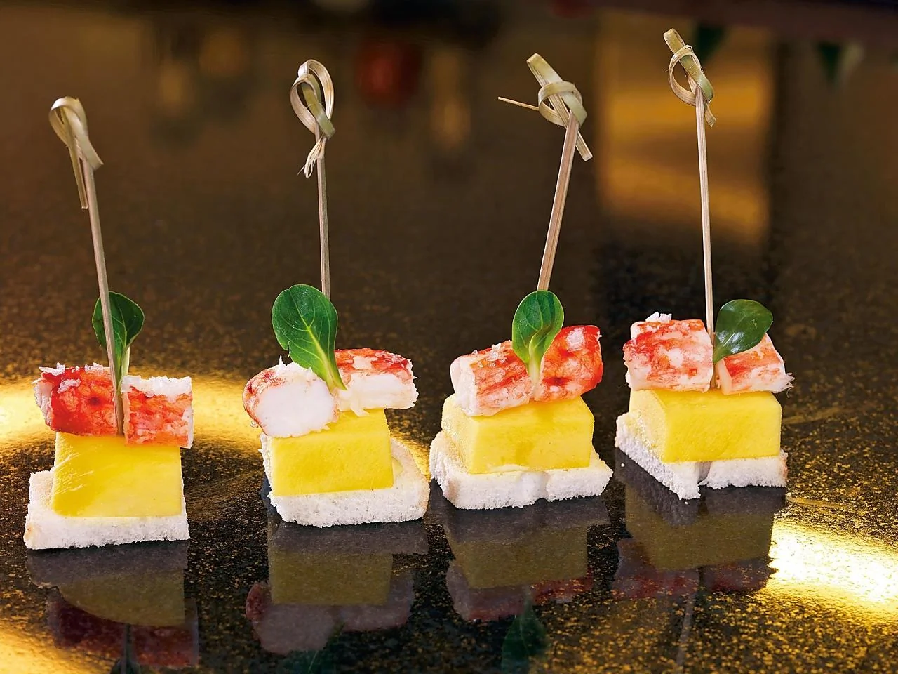 ШАГ 3 Нарезать небольшими аккуратными кусочками половину манго. На хлеб выложить немного яичного соуса (на четыре порции понадобится примерно одна столовая ложка), затем кусочки манго и сверху фаланги краба. Украсить листиками корна.