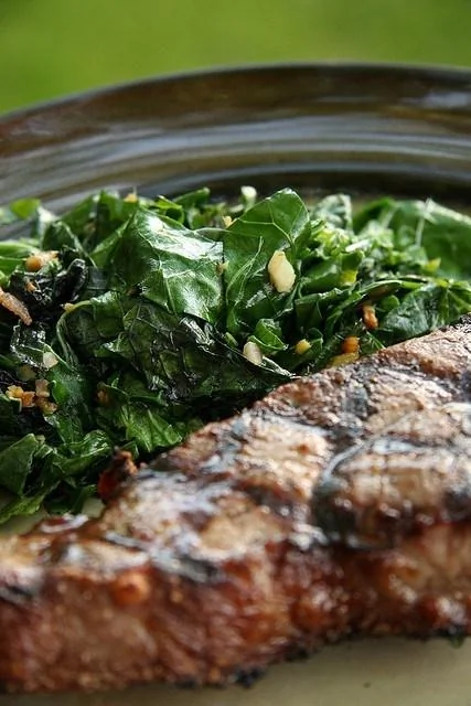 Жареная листовая капуста с луком и кунжутным маслом