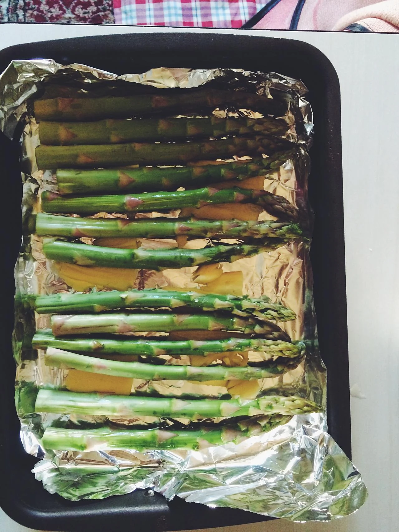 ШАГ 3 Выложите спаржу на застеленный фольгой противень или в форму и сбрызните оливковым маслом, хорошо перемешайте и посыпьте сверху измельченным чесноком, солью и перцем. Снова перемешайте.