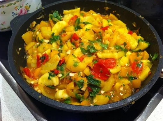 ШАГ 1 Кабачки очистить от семечек и поролоновых внутренностей (если вы используете цукини, эту хирургическую операцию можно не проводить), нарезать крупными кусками (три-четыре сантиметра). Лук мелко нарубить. А помидоры нарезать примерно вдвое меньшими кусочками по сравнению с кабачками.